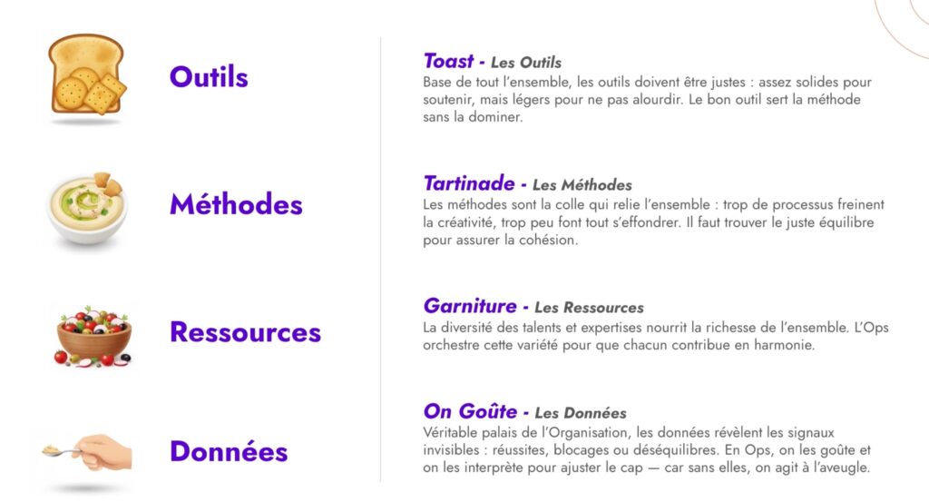 2. La Méthode (La Tartinade) : C’est le liant qui donne de la cohérence à l’ensemble. Sans processus clair, les ingrédients s’éparpillent. La méthode définit comment on travaille, comment on priorise et comment on communique. Le défi de l’Ops est de trouver le dosage parfait : trop de processus ou de validation fige la créativité ; pas assez, et tout s’effondre lors du premier coup de feu.